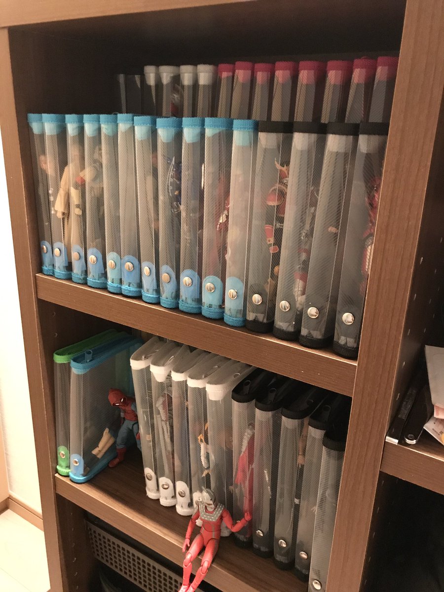 ねぎかつセブン 先ほどのツイートでご好評いただいので紹介しますと これは100円ショップで売ってるペンケースです 外に持ち出すにも便利ですし 本棚にも収納できるので 増え過ぎて飾るスペースに困った方にはオススメです 窮屈そうでちょっと可哀想